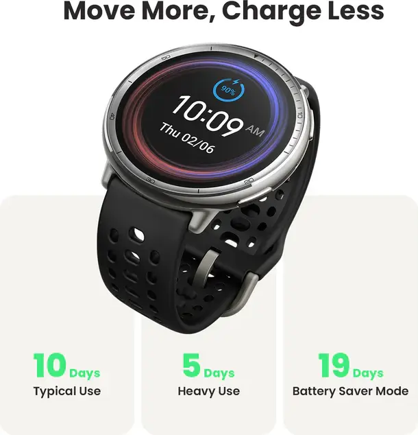 Часы работают до 10 дней при обычном использовании, до 5 дней при интенсивной нагрузке и до 21 часа при включенном GPS. Забудьте о постоянной подзарядке и оставайтесь активными весь день.