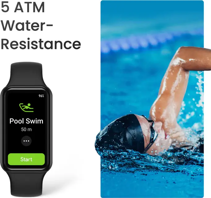 Класс 5 ATM — эквивалент давления на глубине до 50 м. Режим Pool Swimming позволяет научно отслеживать показатели плавания.